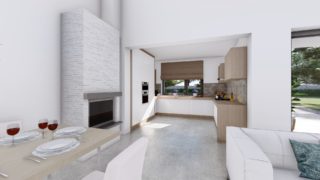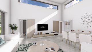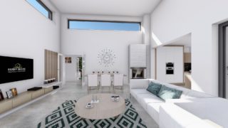 Krásny projekt bungalovu, vhodný na rovinatý alebo mierne svahovitý terén. Tento priestranný 4 izbový rodinný dom je ideálny pre väčšiu rodinu. V dome nájdete aj kráľovstvo rodičov, kde spálňa rodičov je vybavená vlastným šatníkom a kúpeľňou. Projekt domu je obohatený aj o veľké sklenené plochy v obývacej izbe, čo zaručuje krásne presvetlené priestory. Rodinné domy s plochou strechou, príp. rovnou strechou sú jedinečným a zaujímavým riešením, ako získať nevšedný a moderný vzhľad domu. Ďalšia kúpeľňa okrem tej hlavnej poteší každého člena rodiny. Samostatný šatník je snom azda každej ženy, kde sa pohodlne zmestí všetok oblečenie. Ku kuchyni prislúcha aj špajza, ktorá je veľmi praktickým riešením na umiestnenie veľkého množstva jedla a kuchynského náradia. Na priestrannej terase si užije oddych celá rodina. V prípade tohto domu si môžete zvoliť projekt domu ako aj stavbu domu na kľúč v dvoch prevedeniach: moderný dom, prípadne pasívny dom, ktorý môže byť až 3x úspornejší, ako klasický rodinný dom. Projekt tohto nízkoenergetického domu je dostupný aj v zrkadlovom prevedení, takisto sú možné menšie aj väčšie úpravy v projekte. V prípade stavby domu si môžete zvoliť alternatívy: holodom, hrubá stavba alebo rodinný dom na kľúč.