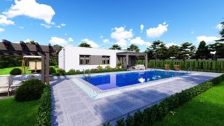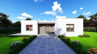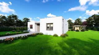 Krásny projekt bungalovu, vhodný na rovinatý alebo mierne svahovitý terén. Tento priestranný 4 izbový rodinný dom je ideálny pre väčšiu rodinu. Projekt domu je obohatený aj o veľké sklenené plochy v obývacej izbe, čo zaručuje krásne presvetlené priestory. Na priestrannej terase si užije oddych celá rodina. Rodinné domy s plochou strechou, príp. rovnou strechou sú jedinečným a zaujímavým riešením, ako získať nevšedný a moderný vzhľad domu. Technická miestnosť je praktickou súčasťou domu, nemusíte sa starať o to, kam umiestniť práčku, sušicku, kotoľ, príp. tepeľné čerpadlo. V prípade tohto domu si môžete zvoliť projekt domu ako aj stavbu domu na kľúč v dvoch prevedeniach: moderný dom, prípadne pasívny dom, ktorý môže byť až 3x úspornejší, ako klasický rodinný dom. Tento projekt veľkého rodinného domu spája v sebe veľa výhod: má vzdušnú a priestrannú dennú časť, no všetci členovia majú aj svoj vlastný priestor pre oddych. Ku kuchyni prislúcha aj špajza, ktorá je veľmi praktickým riešením na umiestnenie veľkého množstva jedla a kuchynského náradia. Projekt tohto nízkoenergetického domu je dostupný aj v zrkadlovom prevedení, takisto sú možné menšie aj väčšie úpravy v projekte. V prípade stavby domu si môžete zvoliť alternatívy: holodom, hrubá stavba alebo rodinný dom na kľúč.
