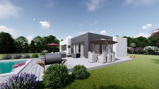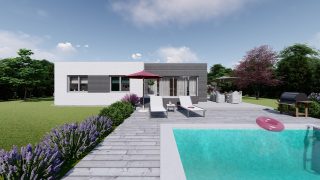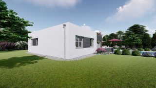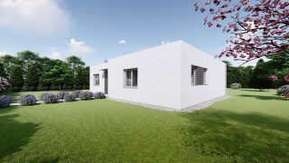 Krásny projekt bungalovu, vhodný na rovinatý alebo mierne svahovitý terén. Tento priestranný 4 izbový rodinný dom je ideálny pre väčšiu rodinu. Projekt domu je obohatený aj o veľké sklenené plochy v obývacej izbe, čo zaručuje krásne presvetlené priestory. Na priestrannej terase si užije oddych celá rodina. Rodinné domy s plochou strechou, príp. rovnou strechou sú jedinečným a zaujímavým riešením, ako získať nevšedný a moderný vzhľad domu. Ďalšia kúpeľňa okrem tej hlavnej poteší každého člena rodiny. Ku kuchyni prislúcha aj špajza, ktorá je veľmi praktickým riešením na umiestnenie veľkého množstva jedla a kuchynského náradia. V prípade tohto domu si môžete zvoliť projekt domu ako aj stavbu domu na kľúč v dvoch prevedeniach: moderný dom, prípadne pasívny dom, ktorý môže byť až 3x úspornejší, ako klasický rodinný dom. Projekt tohto nízkoenergetického domu je dostupný aj v zrkadlovom prevedení, takisto sú možné menšie aj väčšie úpravy v projekte. V prípade stavby domu si môžete zvoliť alternatívy: holodom, hrubá stavba alebo rodinný dom na kľúč.