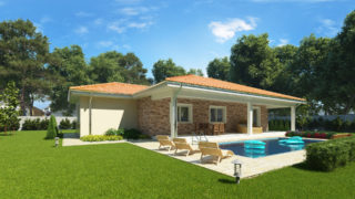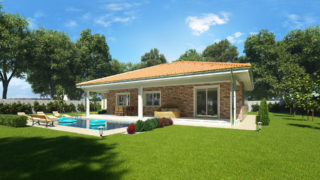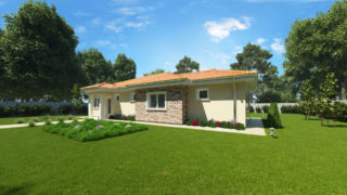 Krásny projekt bungalovu, vhodný na rovinatý alebo mierne svahovitý terén. Tento priestranný rodinný dom je vhodný pre väčšiu - päťčlennú alebo štvorčlennú rodinu s hosťovskou izbou. Projekt domu je obohatený aj o veľké sklenené plochy v obývacej izbe, čo zaručuje krásne presvetlené priestory. Na priestrannej terase si užije oddych celá rodina. Dom disponuje šikmou strechou, ktorá vytvára klasický a romantický vzhľad. Výhodou šikmých striech je variabilita a možnosť prispôsobenia ceľkového vzhľadu domu práve pomocou strechy. Ďalšia kúpeľňa okrem tej hlavnej poteší každého člena rodiny. Samostatný šatník je snom azda každej ženy, kde sa pohodlne zmestí všetok oblečenie. Ďalšia toaleta poteší nielen návštevy. Technická miestnosť je praktickou súčasťou domu, nemusíte sa starať o to, kam umiestniť práčku, sušicku, kotoľ, príp. tepeľné čerpadlo. Projekt domu ako aj stavba domu na kľúč je dostupná v dvoch prevedeniach: môžete si zvoliť alternatívu, či Vám vyhovuje viac klasický murovaný alebo skôr montovaný rodinný dom. Projekt tohto nízkoenergetického domu je dostupný aj v zrkadlovom prevedení, takisto sú možné menšie aj väčšie úpravy v projekte. V prípade stavby domu si môžete zvoliť alternatívy: holodom, hrubá stavba alebo rodinný dom na kľúč.