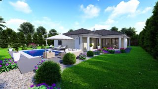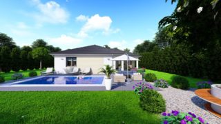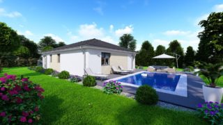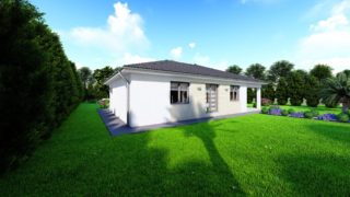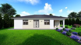 Projekt bungalovu predstavuje ideálne bývanie pre tých, ktorí uprednostňujú jednopodlažné rodinné domy. Krásne 3 spálne tohto rodinného domu zaručujú pokojné bývanie pre stredne veľkú až veľkú rodinu. Projekt domu je obohatený aj o veľké sklenené plochy v obývacej izbe, čo zaručuje krásne presvetlené priestory. Dom disponuje šikmou strechou, ktorá vytvára klasický a romantický vzhľad. Výhodou šikmých striech je variabilita a možnosť prispôsobenia ceľkového vzhľadu domu práve pomocou strechy. Pôdorys rodinného domu má tvar písmena ''L'', čo zaručuje pocit súkromia zo strany susedov. Pri stavbe domu treba zohľadniť aj dostatočné krytie terasy. Priestrannú obývaciu časť tvorí aj americká kuchyňa, ktorá môže byť vybavená aj kuchynským ostrovčekom. Táto forma kuchyne je veľmi moderná a ponúka veľa kreatívnej slobody pri varení. Na priestrannej terase si užije oddych celá rodina. Tento projekt veľkého rodinného domu spája v sebe veľa výhod: má vzdušnú a priestrannú dennú časť, no všetci členovia majú aj svoj vlastný priestor pre oddych. Samostatný šatník je snom azda každej ženy, kde sa pohodlne zmestí všetok oblečenie. Technická miestnosť je praktickou súčasťou domu, nemusíte sa starať o to, kam umiestniť práčku, sušicku, kotoľ, príp. tepeľné čerpadlo. Projekt tohto nízkoenergetického domu je dostupný aj v zrkadlovom prevedení, takisto sú možné menšie aj väčšie úpravy v projekte. V prípade stavby domu si môžete zvoliť alternatívy: holodom, hrubá stavba alebo rodinný dom na kľúč. Projekt domu ako aj stavba domu na kľúč je dostupná v dvoch prevedeniach: môžete si zvoliť alternatívu, či Vám vyhovuje viac klasický murovaný alebo skôr montovaný rodinný dom.