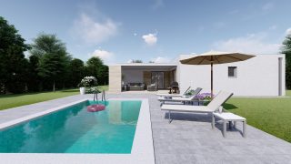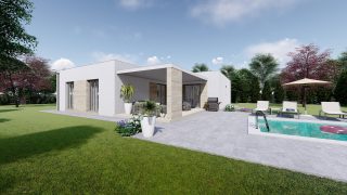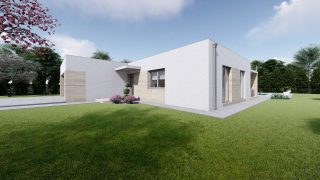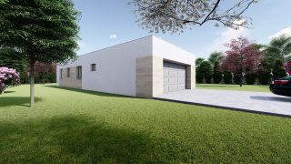 Krásny projekt bungalovu, vhodný na rovinatý alebo mierne svahovitý terén. Tento projekt veľkého rodinného domu spája v sebe veľa výhod: má vzdušnú a priestrannú dennú časť, no všetci členovia majú aj svoj vlastný priestor pre oddych. Tento priestranný 4 izbový rodinný dom je ideálny pre väčšiu rodinu. Ďalšia kúpeľňa okrem tej hlavnej poteší každého člena rodiny. Samostatný šatník je snom azda každej ženy, kde sa pohodlne zmestí všetok oblečenie. Ku kuchyni prislúcha aj špajza, ktorá je veľmi praktickým riešením na umiestnenie veľkého množstva jedla a kuchynského náradia. Rodinný dom je vybavený dvojgarážou, čím sa poskytne miesto nielen pre Vaše autá, ale môže slúžiť aj ako odkladací priestor pre rôzne náradia. Rodinné domy s plochou strechou, príp. rovnou strechou sú jedinečným a zaujímavým riešením, ako získať nevšedný a moderný vzhľad domu. Pôdorys rodinného domu má tvar písmena ''L'', čo zaručuje pocit súkromia zo strany susedov. Pri stavbe domu treba zohľadniť aj dostatočné krytie terasy. V prípade tohto domu si môžete zvoliť projekt domu ako aj stavbu domu na kľúč v dvoch prevedeniach: moderný dom, prípadne pasívny dom, ktorý môže byť až 3x úspornejší, ako klasický rodinný dom. Projekt tohto nízkoenergetického domu je dostupný aj v zrkadlovom prevedení, takisto sú možné menšie aj väčšie úpravy v projekte. V prípade stavby domu si môžete zvoliť alternatívy: holodom, hrubá stavba alebo rodinný dom na kľúč.