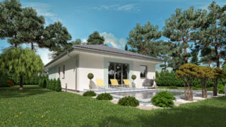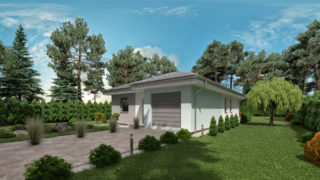 Krásny projekt bungalovu, vhodný na rovinatý alebo mierne svahovitý terén. Tento skromný 3 izbový dom je ideálny pre troj- až štvorčlennú rodinu. Projekt domu je obohatený aj o veľké sklenené plochy v obývacej izbe, čo zaručuje krásne presvetlené priestory. Dom disponuje šikmou strechou, ktorá vytvára klasický a romantický vzhľad. Výhodou šikmých striech je variabilita a možnosť prispôsobenia ceľkového vzhľadu domu práve pomocou strechy. Tento nádherný rodinný dom disponuje aj garážou, kde sa nájde miesto nielen pre Vaše auto, ale poskytuje odkladací priestor aj pre rôzne náradia na údržbu záhrady aj auta. Projekt domu je dokonca vhodný aj na úzky pozemok. Ďalšia toaleta poteší nielen návštevy. Projekt domu ako aj stavba domu na kľúč je dostupná v dvoch prevedeniach: môžete si zvoliť alternatívu, či Vám vyhovuje viac klasický murovaný alebo skôr montovaný rodinný dom. Projekt tohto nízkoenergetického domu je dostupný aj v zrkadlovom prevedení, takisto sú možné menšie aj väčšie úpravy v projekte. V prípade stavby domu si môžete zvoliť alternatívy: holodom, hrubá stavba alebo rodinný dom na kľúč.