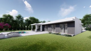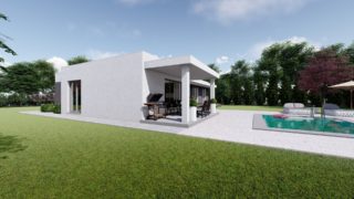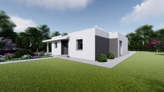 Krásny projekt bungalovu, vhodný na rovinatý alebo mierne svahovitý terén. Tento priestranný 4 izbový rodinný dom je ideálny pre väčšiu rodinu. Priestrannú obývaciu časť tvorí aj americká kuchyňa, ktorá môže byť vybavená aj kuchynským ostrovčekom. Táto forma kuchyne je veľmi moderná a ponúka veľa kreatívnej slobody pri varení. Projekt domu je obohatený aj o veľké sklenené plochy v obývacej izbe, čo zaručuje krásne presvetlené priestory. Na priestrannej terase si užije oddych celá rodina. Rodinné domy s plochou strechou, príp. rovnou strechou sú jedinečným a zaujímavým riešením, ako získať nevšedný a moderný vzhľad domu. Garážové státie ponúka pohodlné parkovanie priamo pri dome. Samostatný šatník je snom azda každej ženy, kde sa pohodlne zmestí všetok oblečenie. Technická miestnosť je praktickou súčasťou domu, nemusíte sa starať o to, kam umiestniť práčku, sušicku, kotoľ, príp. tepeľné čerpadlo. V prípade tohto domu si môžete zvoliť projekt domu ako aj stavbu domu na kľúč v dvoch prevedeniach: moderný dom, prípadne pasívny dom, ktorý môže byť až 3x úspornejší, ako klasický rodinný dom. Projekt tohto nízkoenergetického domu je dostupný aj v zrkadlovom prevedení, takisto sú možné menšie aj väčšie úpravy v projekte. V prípade stavby domu si môžete zvoliť alternatívy: holodom, hrubá stavba alebo rodinný dom na kľúč.