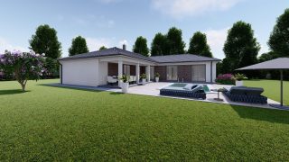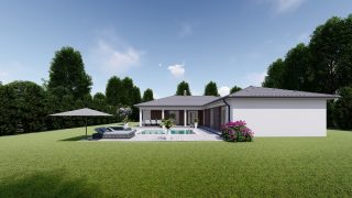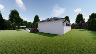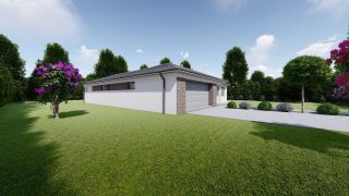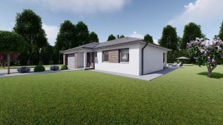 Hľadáte ten „ideálny“ bungalov? My máme riešenie v podobe tohto nádherného jednopodlažného domu. Ideálne riešenie pre väčšie rodiny, nakoľko tento nádherný murovaný rodinný dom disponuje 4 izbami. Projekt domu je obohatený aj o veľké sklenené plochy v obývacej izbe, čo zaručuje krásne presvetlené priestory. Na priestrannej terase si užije oddych celá rodina. Dom disponuje šikmou strechou, ktorá vytvára klasický a romantický vzhľad. Výhodou šikmých striech je variabilita a možnosť prispôsobenia ceľkového vzhľadu domu práve pomocou strechy. Dvojgaráž, ktorá sa nachádza priamo v rodinnom dome, poskytuje chránené parkovanie pre dve autá. Pôdorys rodinného domu má tvar písmena ''L'', čo zaručuje pocit súkromia zo strany susedov. Pri stavbe domu treba zohľadniť aj dostatočné krytie terasy. Tento projekt veľkého rodinného domu spája v sebe veľa výhod: má vzdušnú a priestrannú dennú časť, no všetci členovia majú aj svoj vlastný priestor pre oddych. Ďalšia kúpeľňa okrem tej hlavnej poteší každého člena rodiny. Samostatný šatník je snom azda každej ženy, kde sa pohodlne zmestí všetok oblečenie. Ku kuchyni prislúcha aj špajza, ktorá je veľmi praktickým riešením na umiestnenie veľkého množstva jedla a kuchynského náradia. Ďalšia toaleta poteší nielen návštevy. Technická miestnosť je praktickou súčasťou domu, nemusíte sa starať o to, kam umiestniť práčku, sušicku, kotoľ, príp. tepeľné čerpadlo. Projekt domu ako aj stavba domu na kľúč je dostupná v dvoch prevedeniach: môžete si zvoliť alternatívu, či Vám vyhovuje viac klasický murovaný alebo skôr montovaný rodinný dom. Projekt tohto nízkoenergetického domu je dostupný aj v zrkadlovom prevedení, takisto sú možné menšie aj väčšie úpravy v projekte. V prípade stavby domu si môžete zvoliť alternatívy: holodom, hrubá stavba alebo rodinný dom na kľúč.