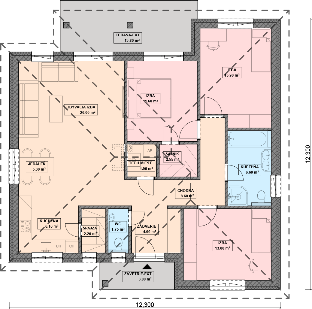Pri navrhovaní projektov domov vždy dbáme na to, aby pôdorys a celkové dispozičné riešenie domu bol premyslený do najmenších detailov, a tým sa získa plnohodnotný a funkčný domov. Vždy sa snažíme o to, aby dom bol plne funkčný nielen v interiéri, ale mal zaujímavý aj exteriér. Vyberte si tento rodinný dom na základe jeho rozumného pôdorysu!