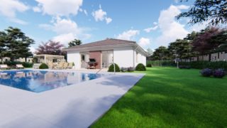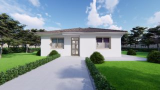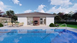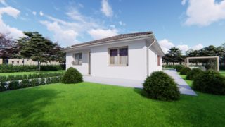 Krásny projekt bungalovu, vhodný na rovinatý alebo mierne svahovitý terén. Tento priestranný 4 izbový rodinný dom je ideálny pre väčšiu rodinu. Projekt domu je obohatený aj o veľké sklenené plochy v obývacej izbe, čo zaručuje krásne presvetlené priestory. Dom disponuje šikmou strechou, ktorá vytvára klasický a romantický vzhľad. Výhodou šikmých striech je variabilita a možnosť prispôsobenia ceľkového vzhľadu domu práve pomocou strechy. Ďalšia kúpeľňa okrem tej hlavnej poteší každého člena rodiny. Ku kuchyni prislúcha aj špajza, ktorá je veľmi praktickým riešením na umiestnenie veľkého množstva jedla a kuchynského náradia. Technická miestnosť je praktickou súčasťou domu, nemusíte sa starať o to, kam umiestniť práčku, sušicku, kotoľ, príp. tepeľné čerpadlo. Projekt domu ako aj stavba domu na kľúč je dostupná v dvoch prevedeniach: môžete si zvoliť alternatívu, či Vám vyhovuje viac klasický murovaný alebo skôr montovaný rodinný dom. Projekt tohto nízkoenergetického domu je dostupný aj v zrkadlovom prevedení, takisto sú možné menšie aj väčšie úpravy v projekte. V prípade stavby domu si môžete zvoliť alternatívy: holodom, hrubá stavba alebo rodinný dom na kľúč. Projekt domu je dokonca vhodný aj na úzky pozemok.