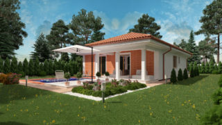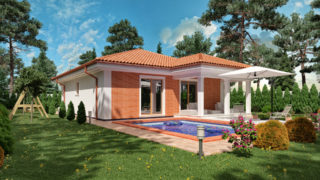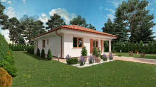 Krásny projekt bungalovu, vhodný na rovinatý alebo mierne svahovitý terén. Tento skromný 3 izbový dom je ideálny pre troj- až štvorčlennú rodinu. Dom disponuje šikmou strechou, ktorá vytvára klasický a romantický vzhľad. Výhodou šikmých striech je variabilita a možnosť prispôsobenia ceľkového vzhľadu domu práve pomocou strechy. Tento projekt malého domu má veľké výhody oproti veľkým stavbám, nakoľko predstavuje malé náklady na bývanie vďaka nízkym prevádzkovým nákladom. Ku kuchyni prislúcha aj špajza, ktorá je veľmi praktickým riešením na umiestnenie veľkého množstva jedla a kuchynského náradia. Ďalšia toaleta poteší nielen návštevy. Technická miestnosť je praktickou súčasťou domu, nemusíte sa starať o to, kam umiestniť práčku, sušicku, kotoľ, príp. tepeľné čerpadlo. Projekt domu ako aj stavba domu na kľúč je dostupná v dvoch prevedeniach: môžete si zvoliť alternatívu, či Vám vyhovuje viac klasický murovaný alebo skôr montovaný rodinný dom. Projekt tohto nízkoenergetického domu je dostupný aj v zrkadlovom prevedení, takisto sú možné menšie aj väčšie úpravy v projekte. V prípade stavby domu si môžete zvoliť alternatívy: holodom, hrubá stavba alebo rodinný dom na kľúč.