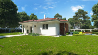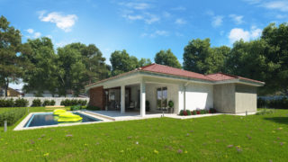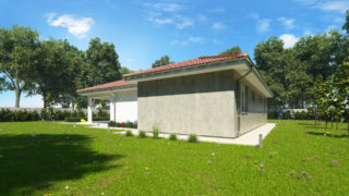 Krásny projekt bungalovu, vhodný na rovinatý alebo mierne svahovitý terén. Tento priestranný rodinný dom je vhodný pre väčšiu - päťčlennú alebo štvorčlennú rodinu s hosťovskou izbou. Na priestrannej terase si užije oddych celá rodina. Dom disponuje šikmou strechou, ktorá vytvára klasický a romantický vzhľad. Výhodou šikmých striech je variabilita a možnosť prispôsobenia ceľkového vzhľadu domu práve pomocou strechy. Pôdorys rodinného domu má tvar písmena ''L'', čo zaručuje pocit súkromia zo strany susedov. Pri stavbe domu treba zohľadniť aj dostatočné krytie terasy. Ďalšia kúpeľňa okrem tej hlavnej poteší každého člena rodiny. Samostatný šatník je snom azda každej ženy, kde sa pohodlne zmestí všetok oblečenie. Ku kuchyni prislúcha aj špajza, ktorá je veľmi praktickým riešením na umiestnenie veľkého množstva jedla a kuchynského náradia. Ďalšia toaleta poteší nielen návštevy. Technická miestnosť je praktickou súčasťou domu, nemusíte sa starať o to, kam umiestniť práčku, sušicku, kotoľ, príp. tepeľné čerpadlo. Projekt domu ako aj stavba domu na kľúč je dostupná v dvoch prevedeniach: môžete si zvoliť alternatívu, či Vám vyhovuje viac klasický murovaný alebo skôr montovaný rodinný dom. Projekt tohto nízkoenergetického domu je dostupný aj v zrkadlovom prevedení, takisto sú možné menšie aj väčšie úpravy v projekte. V prípade stavby domu si môžete zvoliť alternatívy: holodom, hrubá stavba alebo rodinný dom na kľúč.