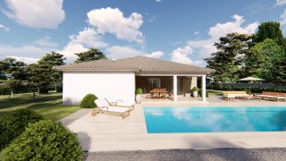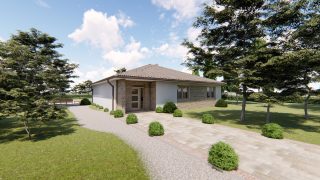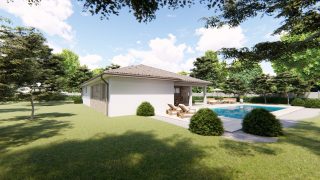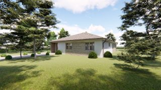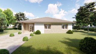 Projekt bungalovu predstavuje ideálne bývanie pre tých, ktorí uprednostňujú jednopodlažné rodinné domy. 5 izbový dom vhodný pre väčšie rodiny. Dispozícia rodinného domu vďaka svojim veľkorysým rozmerom vyhovuje všetkým členom rodiny, kde každý člen rodiny bude mať svoj vlastný priestor. Pôdorys rodinného domu má tvar písmena ''L'', čo zaručuje pocit súkromia zo strany susedov. Pri stavbe domu treba zohľadniť aj dostatočné krytie terasy. Priestrannú obývaciu časť tvorí aj americká kuchyňa, ktorá môže byť vybavená aj kuchynským ostrovčekom. Táto forma kuchyne je veľmi moderná a ponúka veľa kreatívnej slobody pri varení. Ďalšia kúpeľňa okrem tej hlavnej poteší každého člena rodiny. Samostatný šatník je snom azda každej ženy, kde sa pohodlne zmestí všetok oblečenie. Ku kuchyni prislúcha aj špajza, ktorá je veľmi praktickým riešením na umiestnenie veľkého množstva jedla a kuchynského náradia. Projekt domu je obohatený aj o veľké sklenené plochy v obývacej izbe, čo zaručuje krásne presvetlené priestory. Na priestrannej terase si užije oddych celá rodina. Tento projekt veľkého rodinného domu spája v sebe veľa výhod: má vzdušnú a priestrannú dennú časť, no všetci členovia majú aj svoj vlastný priestor pre oddych. Projekt domu ako aj stavba domu na kľúč je dostupná v dvoch prevedeniach: môžete si zvoliť alternatívu, či Vám vyhovuje viac klasický murovaný alebo skôr montovaný rodinný dom. Projekt tohto nízkoenergetického domu je dostupný aj v zrkadlovom prevedení, takisto sú možné menšie aj väčšie úpravy v projekte. V prípade stavby domu si môžete zvoliť alternatívy: holodom, hrubá stavba alebo rodinný dom na kľúč.
