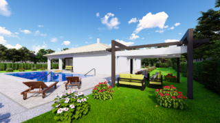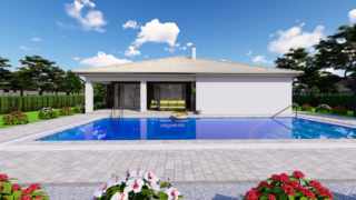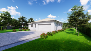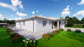 Projekt bungalovu predstavuje ideálne bývanie pre tých, ktorí uprednostňujú jednopodlažné rodinné domy. 5 izbový dom vhodný pre väčšie rodiny. Dispozícia rodinného domu vďaka svojim veľkorysým rozmerom vyhovuje všetkým členom rodiny, kde každý člen rodiny bude mať svoj vlastný priestor. V dome nájdete aj kráľovstvo rodičov, kde spálňa rodičov je vybavená vlastným šatníkom a kúpeľňou. Priestrannú obývaciu časť tvorí aj americká kuchyňa, ktorá môže byť vybavená aj kuchynským ostrovčekom. Táto forma kuchyne je veľmi moderná a ponúka veľa kreatívnej slobody pri varení. Projekt domu je obohatený aj o veľké sklenené plochy v obývacej izbe, čo zaručuje krásne presvetlené priestory. Na priestrannej terase si užije oddych celá rodina. Dom disponuje šikmou strechou, ktorá vytvára klasický a romantický vzhľad. Výhodou šikmých striech je variabilita a možnosť prispôsobenia ceľkového vzhľadu domu práve pomocou strechy. Ďalšia kúpeľňa okrem tej hlavnej poteší každého člena rodiny. Samostatný šatník je snom azda každej ženy, kde sa pohodlne zmestí všetok oblečenie. Ku kuchyni prislúcha aj špajza, ktorá je veľmi praktickým riešením na umiestnenie veľkého množstva jedla a kuchynského náradia. Rodinný dom je vybavený dvojgarážou, čím sa poskytne miesto nielen pre Vaše autá, ale môže slúžiť aj ako odkladací priestor pre rôzne náradia. Tento projekt veľkého rodinného domu spája v sebe veľa výhod: má vzdušnú a priestrannú dennú časť, no všetci členovia majú aj svoj vlastný priestor pre oddych. Technická miestnosť je praktickou súčasťou domu, nemusíte sa starať o to, kam umiestniť práčku, sušicku, kotoľ, príp. tepeľné čerpadlo. Projekt domu ako aj stavba domu na kľúč je dostupná v dvoch prevedeniach: môžete si zvoliť alternatívu, či Vám vyhovuje viac klasický murovaný alebo skôr montovaný rodinný dom. Projekt tohto nízkoenergetického domu je dostupný aj v zrkadlovom prevedení, takisto sú možné menšie aj väčšie úpravy v projekte. V prípade stavby domu si môžete zvoliť alternatívy: holodom, hrubá stavba alebo rodinný dom na kľúč.