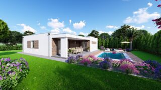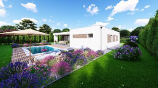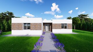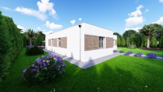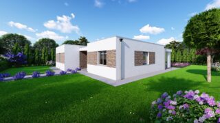 Krásny projekt bungalovu, vhodný na rovinatý alebo mierne svahovitý terén. Tento priestranný rodinný dom je vhodný pre väčšiu - päťčlennú alebo štvorčlennú rodinu s hosťovskou izbou. Rodinné domy s plochou strechou, príp. rovnou strechou sú jedinečným a zaujímavým riešením, ako získať nevšedný a moderný vzhľad domu. Pôdorys rodinného domu má tvar písmena ''L'', čo zaručuje pocit súkromia zo strany susedov. Pri stavbe domu treba zohľadniť aj dostatočné krytie terasy. Tento projekt veľkého rodinného domu spája v sebe veľa výhod: má vzdušnú a priestrannú dennú časť, no všetci členovia majú aj svoj vlastný priestor pre oddych. Ďalšia kúpeľňa okrem tej hlavnej poteší každého člena rodiny. Samostatný šatník je snom azda každej ženy, kde sa pohodlne zmestí všetok oblečenie. V dome nájdete aj kráľovstvo rodičov, kde spálňa rodičov je vybavená vlastným šatníkom a kúpeľňou. Projekt domu je obohatený aj o veľké sklenené plochy v obývacej izbe, čo zaručuje krásne presvetlené priestory. Na priestrannej terase si užije oddych celá rodina. Ku kuchyni prislúcha aj špajza, ktorá je veľmi praktickým riešením na umiestnenie veľkého množstva jedla a kuchynského náradia. Ďalšia toaleta poteší nielen návštevy. Technická miestnosť je praktickou súčasťou domu, nemusíte sa starať o to, kam umiestniť práčku, sušicku, kotoľ, príp. tepeľné čerpadlo. V prípade tohto domu si môžete zvoliť projekt domu ako aj stavbu domu na kľúč v dvoch prevedeniach: moderný dom, prípadne pasívny dom, ktorý môže byť až 3x úspornejší, ako klasický rodinný dom. Projekt tohto nízkoenergetického domu je dostupný aj v zrkadlovom prevedení, takisto sú možné menšie aj väčšie úpravy v projekte. V prípade stavby domu si môžete zvoliť alternatívy: holodom, hrubá stavba alebo rodinný dom na kľúč.