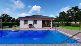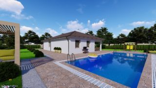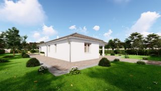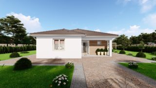 Krásny projekt bungalovu, vhodný na rovinatý alebo mierne svahovitý terén. Tento priestranný rodinný dom je vhodný pre väčšiu - päťčlennú alebo štvorčlennú rodinu s hosťovskou izbou. Projekt domu je obohatený aj o veľké sklenené plochy v obývacej izbe, čo zaručuje krásne presvetlené priestory. Projekt domu je dokonca vhodný aj na úzky pozemok. Dom disponuje šikmou strechou, ktorá vytvára klasický a romantický vzhľad. Výhodou šikmých striech je variabilita a možnosť prispôsobenia ceľkového vzhľadu domu práve pomocou strechy. Pôdorys rodinného domu má tvar písmena ''L'', čo zaručuje pocit súkromia zo strany susedov. Pri stavbe domu treba zohľadniť aj dostatočné krytie terasy. Ďalšia kúpeľňa okrem tej hlavnej poteší každého člena rodiny. Ku kuchyni prislúcha aj špajza, ktorá je veľmi praktickým riešením na umiestnenie veľkého množstva jedla a kuchynského náradia. Ďalšia toaleta poteší nielen návštevy. Technická miestnosť je praktickou súčasťou domu, nemusíte sa starať o to, kam umiestniť práčku, sušicku, kotoľ, príp. tepeľné čerpadlo. Projekt tohto nízkoenergetického domu je dostupný aj v zrkadlovom prevedení, takisto sú možné menšie aj väčšie úpravy v projekte. V prípade stavby domu si môžete zvoliť alternatívy: holodom, hrubá stavba alebo rodinný dom na kľúč.