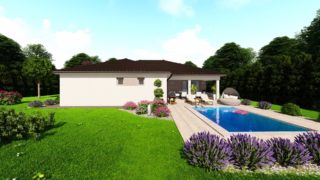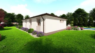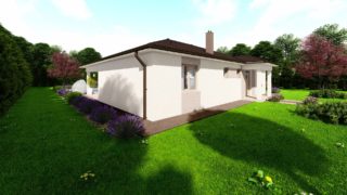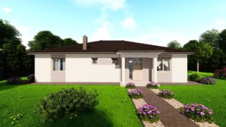 Hľadáte ten „ideálny“ bungalov? My máme riešenie v podobe tohto nádherného jednopodlažného domu. V dome nájdete aj kráľovstvo rodičov, kde spálňa rodičov je vybavená vlastným šatníkom a kúpeľňou. Priestrannú obývaciu časť tvorí aj americká kuchyňa, ktorá môže byť vybavená aj kuchynským ostrovčekom. Táto forma kuchyne je veľmi moderná a ponúka veľa kreatívnej slobody pri varení. Tento 5- izbový rodinný dom je vhodný pre viacčlennú rodinu, s moderným dispozičným riešením. Dom disponuje šikmou strechou, ktorá vytvára klasický a romantický vzhľad. Výhodou šikmých striech je variabilita a možnosť prispôsobenia ceľkového vzhľadu domu práve pomocou strechy. Pôdorys rodinného domu má tvar písmena ''L'', čo zaručuje pocit súkromia zo strany susedov. Pri stavbe domu treba zohľadniť aj dostatočné krytie terasy. Tento projekt veľkého rodinného domu spája v sebe veľa výhod: má vzdušnú a priestrannú dennú časť, no všetci členovia majú aj svoj vlastný priestor pre oddych. Ďalšia kúpeľňa okrem tej hlavnej poteší každého člena rodiny. Samostatný šatník je snom azda každej ženy, kde sa pohodlne zmestí všetok oblečenie. Ku kuchyni prislúcha aj špajza, ktorá je veľmi praktickým riešením na umiestnenie veľkého množstva jedla a kuchynského náradia. Projekt domu je obohatený aj o veľké sklenené plochy v obývacej izbe, čo zaručuje krásne presvetlené priestory. Na priestrannej terase si užije oddych celá rodina. Technická miestnosť je praktickou súčasťou domu, nemusíte sa starať o to, kam umiestniť práčku, sušicku, kotoľ, príp. tepeľné čerpadlo. Projekt tohto nízkoenergetického domu je dostupný aj v zrkadlovom prevedení, takisto sú možné menšie aj väčšie úpravy v projekte. V prípade stavby domu si môžete zvoliť alternatívy: holodom, hrubá stavba alebo rodinný dom na kľúč. Projekt domu ako aj stavba domu na kľúč je dostupná v dvoch prevedeniach: môžete si zvoliť alternatívu, či Vám vyhovuje viac klasický murovaný alebo skôr montovaný rodinný dom.